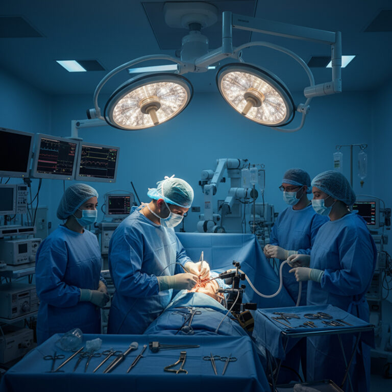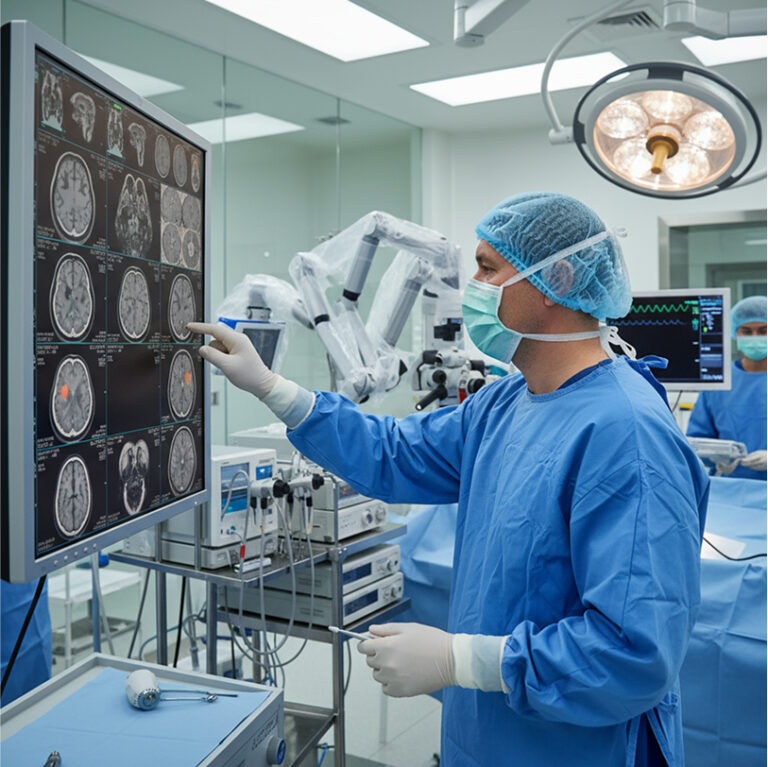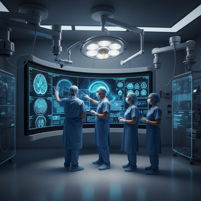 Realistic medical scene showing a neurosurgeon performing a craniotomy in a modern operating room, surgical team in sterile blue attire, focused lighting, no text